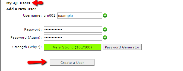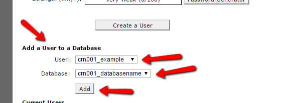 Next, you need to actually create a user for your database. So on that same page, scroll down to MySQL Users and create a new user: