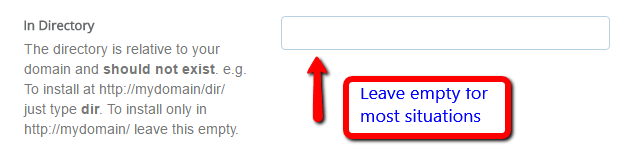 Next, choose the directory in which you want to install WordPress. For 99% of situations, you should leave this field blank. Leaving it empty means WordPress will be installed at your main domain. That is, if your domain is YOURDOMAIN.com, then WordPress will be installed at YOURDOMAIN.com rather than something like YOURDOMAIN.com/mywpsite.