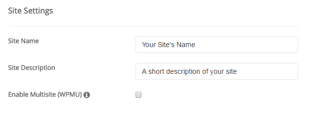 A bit further down, you need to enter your Site Settings. These are just the default values for your site’s name and description. You can always change them later from the WordPress interface:
