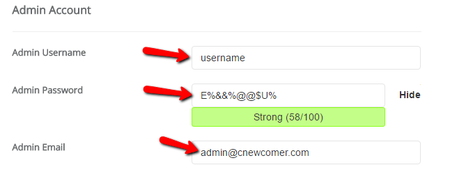 You’ll also need to create login credentials for your WordPress account. You’ll use this username/password combination to log into your WordPress dashboard after installation, so make sure that you remember it: