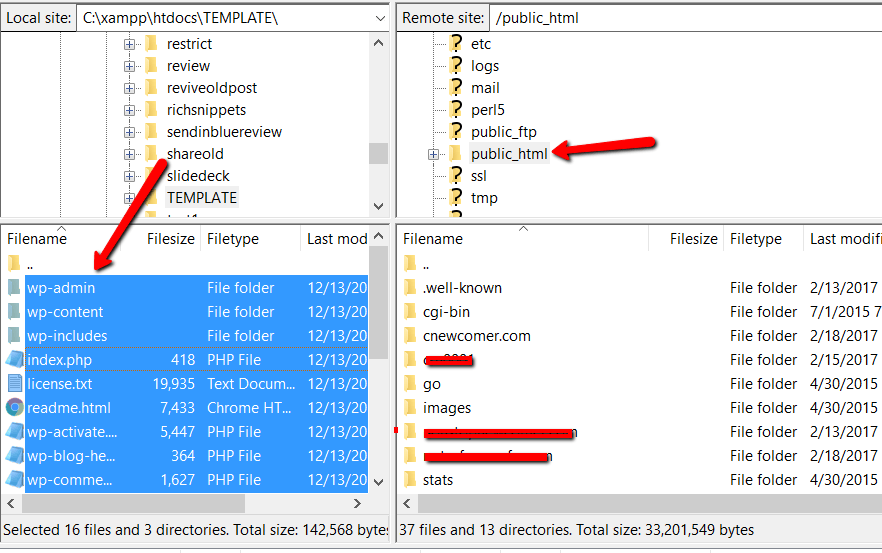 Then unzip the file and upload it to the public_html (or similar) directory of your website. If you’re not sure how to log in to FTP, ask your host for your FTP account information: