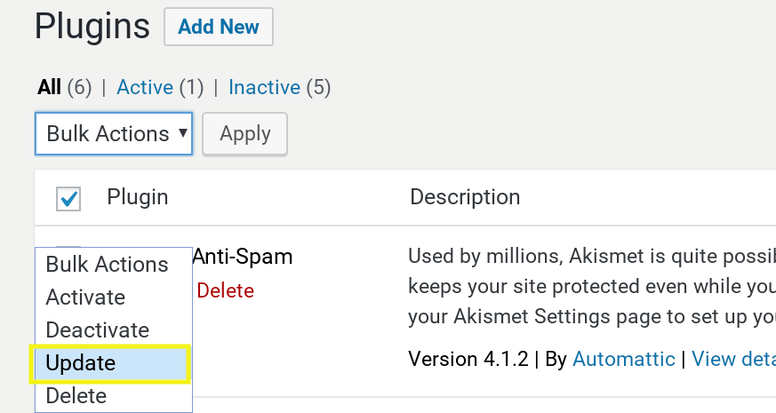 One way to update plugins and themes is to try and do this manually. you’ll head to your WordPress dashboard and navigate to Plugins > Installed Plugins. Then, choose what plugins you would like to update, and click on Update from the Bulk Actions drop-down menu: