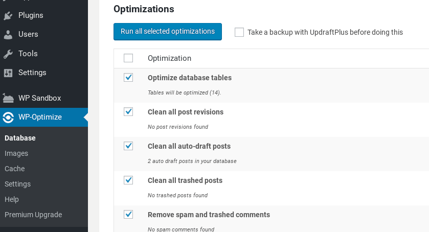 It’s recommended that you create a backup before optimizing your database. If you’re using UpdraftPlus, WP-Optimize has an option to do this just by checking the box next to Run all selected optimizations.